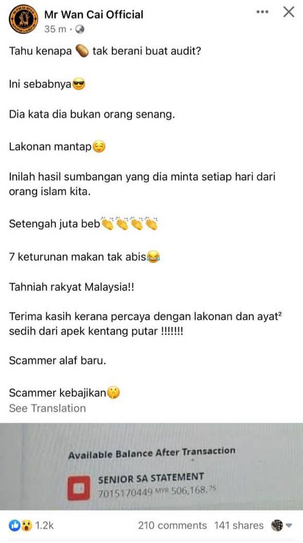 Puak yang ada tansri, datuk, dan duit dah berkepuk-kepuk pun diorang still nak tolong. Yang paling style, diorang ni tak payah pun audit, due-d dan lain-lain. Dia announce RM100 juta, dia bagi hah ambil RM200 juta! Pergilah meniaga..