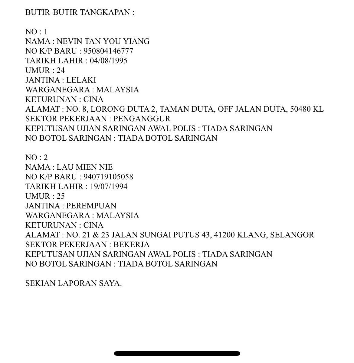 7.2. Semasa pemeriksaan di salah sebuah bilik, terdapat 5 orang pengunjung anggota polis dan telah menjumpai atas meja 1 talam kecil yang mempunyai dadah jenis ketamin (0.73g). 5 penama telah ditahan kerana terlibat dalam kes dadah dan telah diserahkan kepada Bahagian Narkotik IPD Brickfields untuk disiasat dibawah seksyen 12(2) dan 15(1) ADB 1953, Pegawai Penyiasat Insp Nazriana Fareha. Butir-butir penama adalah seperti berikut: