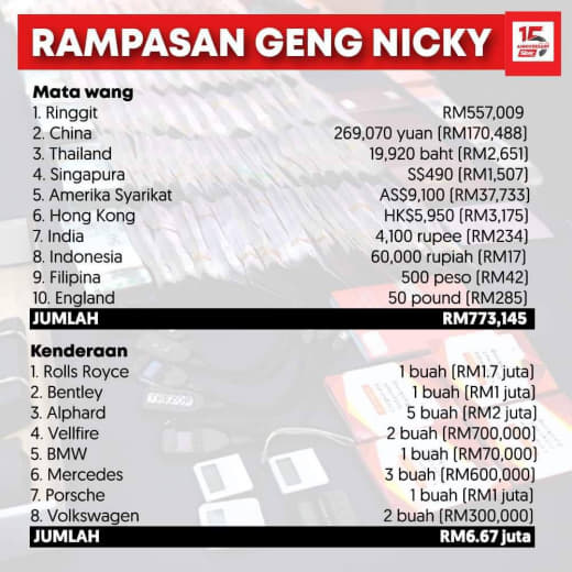 Rampasan: 1 plastik lutsinar serbuk jenis ketamin (2.23g) dan 6 biji pil eramin 5.