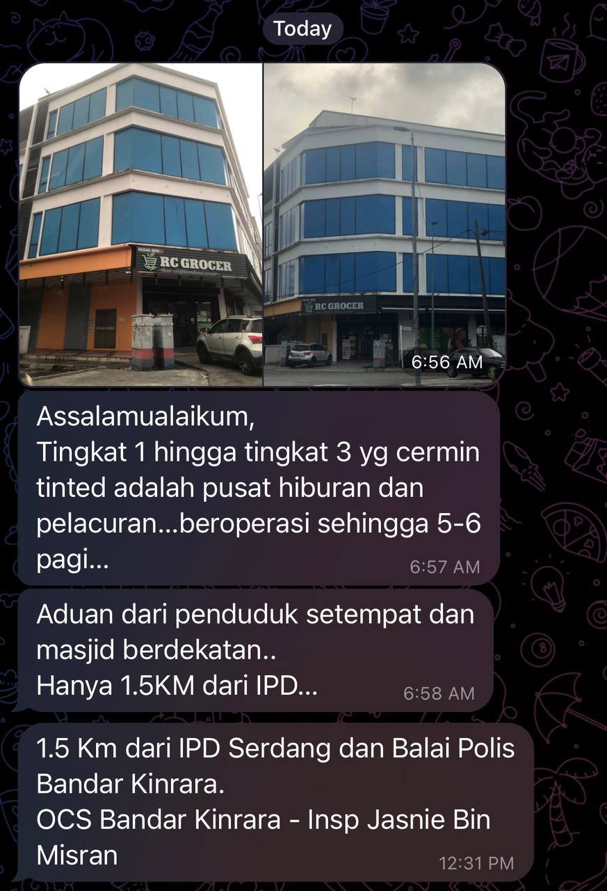 Pengadu 1/L/Melayu Pegawai kanan Polis berpangkat ASP R/O Jips Bukit Aman. Pada 28/10/22 jam l/k 2345 hrs telah membuat serbuan dan pemeriksaan Ops Noda di CLUB 29, No.L6-01, L6-02,Tingkat 6, Menara Up, No.60, Jalan Puchong, 58200 Kuala Lumpur dan telah menangkap 1/L/Cina sebagai penjaga premis, 3/L/Bangladesh dan 1/P/Vietnam sebagai pelayan.