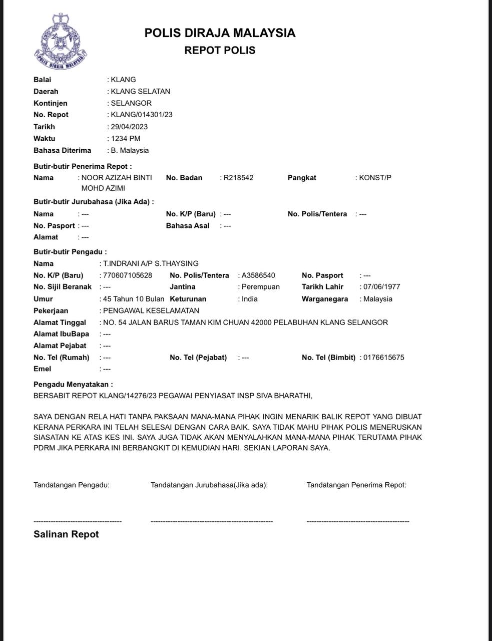 No. Repot: Telok Panglima Garang/ 1231/23